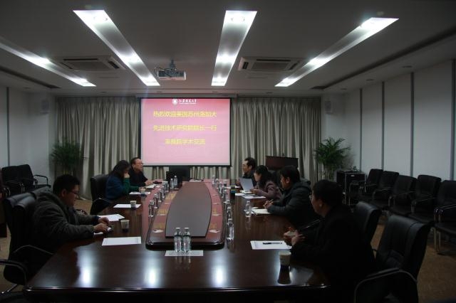 沈德元院长首先对高为雄院长的到来表示欢迎,介绍了江苏省先进激光技术与新兴产业协同创新中心的运行、师资、资源设备、中心取得的成绩等,希望双方能够加强合作,共谋发展。高为雄院长在随后发言中介绍了美国苏州洛加大先进技术研究院基本情况、研究发展方向,并介绍了美国苏州洛加大先进技术研究院远程教学的情况。交流会上,宾主双方进行了友好而热烈的会谈,对将来的合作事宜进行了初步的协商。