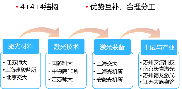 江苏省先进激光技术与新兴产业协同创新中心已形成了一个包括院士、千人计划、长江学者、杰出青年,重大专项专家、省双创人才、特聘教授、海归博士、专业研究人员在内的科研人才梯队。团队成员全部都具有博士学位或长期国外工作经历。现根据各自研究方向,以研究部为单位,以研究团队为主体,以任务为核心将人才团队进行组建。