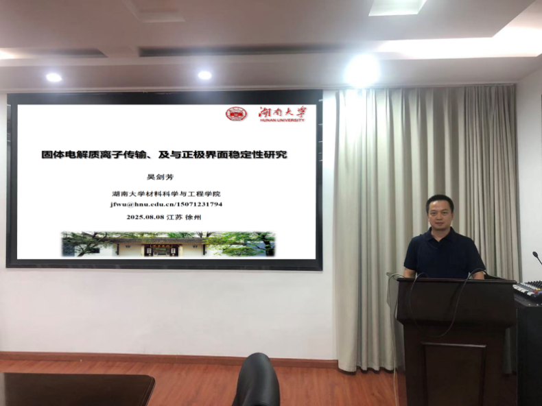 2025年8月8日上午,受江苏师范大学物理与电子工程学院邀请,湖南大学吴剑芳副教授来我院开展学术交流,并在学院428会议室作了题为“固体电解质离子传输及与正极界面稳定性研究”的学术报告,报告会由林雨潇副教授主持,我院部分师生参加了报告会。