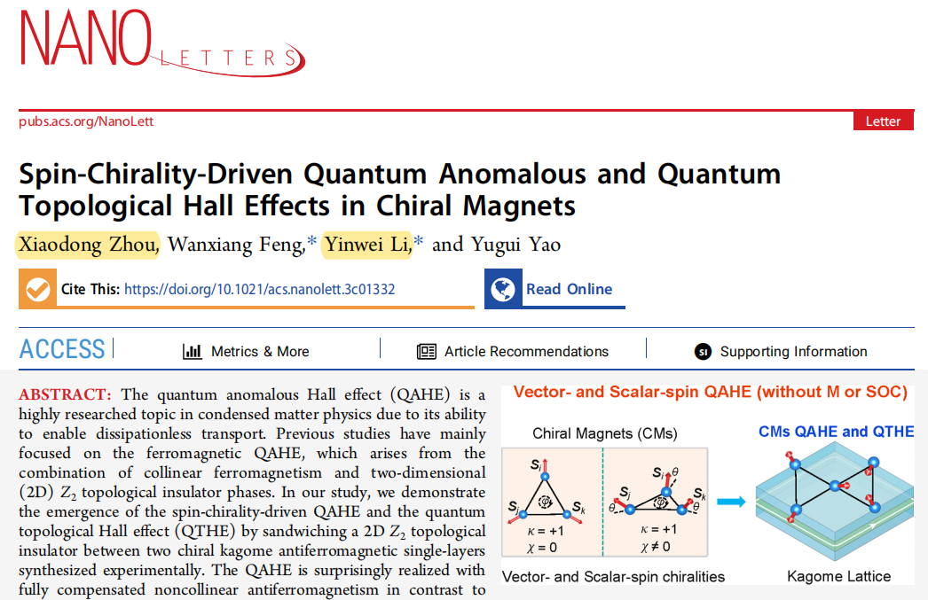 近日,物电学院李印威教授课题组青年教师周小东博士与北京理工大学冯万祥教授、姚裕贵教授等人合作,在反铁磁量子输运研究中取得重要进展,相关研究成果以“Spin-Chirality-Driven Quantum Anomalous and Quantum Topological Hall Effects in Chiral Magnets”为题,发表在国际知名期刊Nano Letters上。江苏师范大学为第一署名单位,周小东博士为第一作者,李印威教授与北京理工大学冯万祥教授为通讯作者,该项工作得到了北京理工大学姚裕贵教授的大力支持。