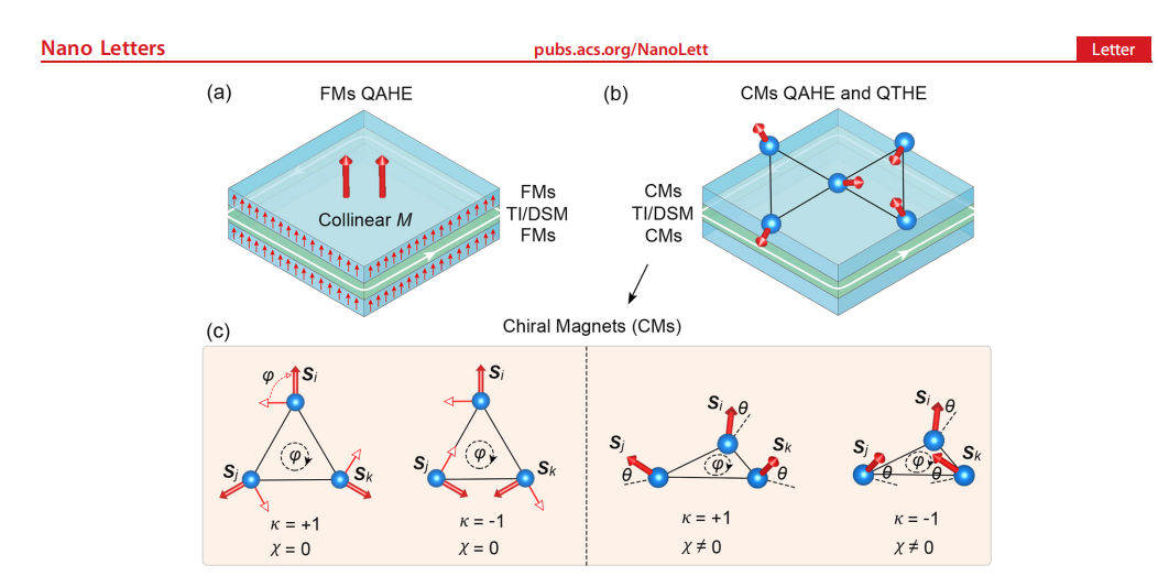 量子反常霍尔效应一直是凝聚态物理学中的热门研究议题,其具有量子化的反常霍尔电导率与无能量耗散的边缘态输运特性,因此被认为是实现高速、低功耗自旋电子学器件最具竞争力的方式之一。虽然量子反常霍尔效应早在1988年就被理论预言,然而直到2013年才首次被清华大学薛其坤研究团队实验证实,主要原因在于其苛刻的实现条件:共线磁化强度引起的时间反演破缺与强自旋轨道耦合诱导的拓扑绝缘态的共同作用,即传统的铁磁体量子反常霍尔效应(图a)。