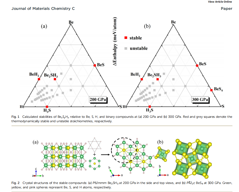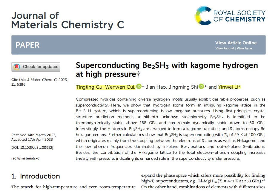 近日,李印威教授课题组在超导材料方面取得新进展,在国际知名期刊《Journal of Materials Chemistry C》(JCR:1区,IF:6.4)上发表了题为“Superconducting Be2SH3 with kagome hydrogen at high pressure”的学术论文,该论文第一作者为我院2021级理论物理硕士研究生顾婷婷,通讯作者为李印威教授和崔文文副教授。
