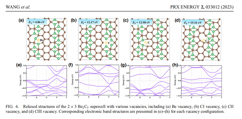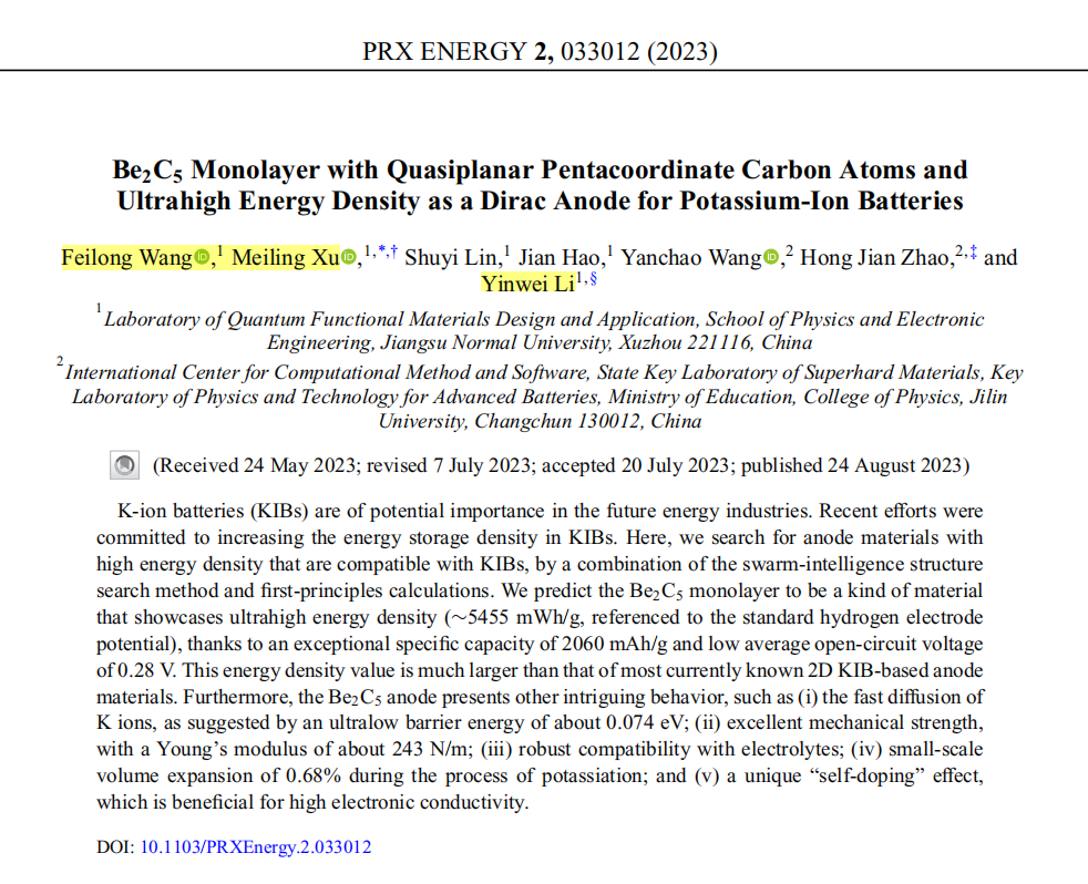 近日,李印威教授课题组在碱金属离子电池负极材料方面取得新进展,在《PRX Enengy》期刊上发表了题为“Be2C5 monolayer with quasiplanar pentacoordinate carbon atoms and ultrahigh energy density as a Dirac anode for potassium-ion batteries”的学术论文,该论文第一作者为我院2021级凝聚态物理研究生王飞龙,通讯作者为李印威教授、徐美玲副教授以及吉林大学赵宏健教授。