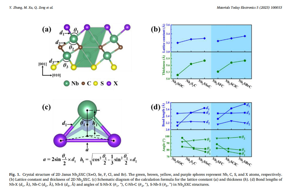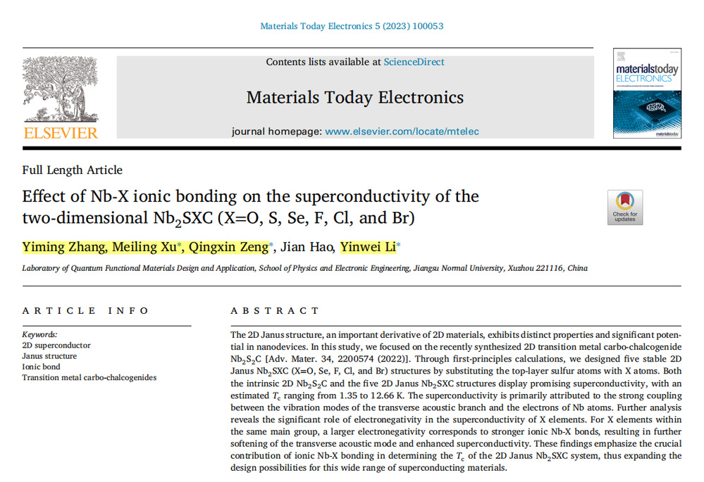 近日,李印威教授课题组在2D材料方面取得新进展,在国际权威期刊《Materials Today Electronics》上发表了题为“Effect of Nb-X ionic bonding on the superconductivity of the two-dimensional Nb2SXC (X = O, S, Se, F, Cl, and Br)”的学术论文。该论文第一作者为我院2022级凝聚态物理硕士研究生张逸铭,通讯作者为李印威教授、徐美玲副教授和曾庆鑫副教授。