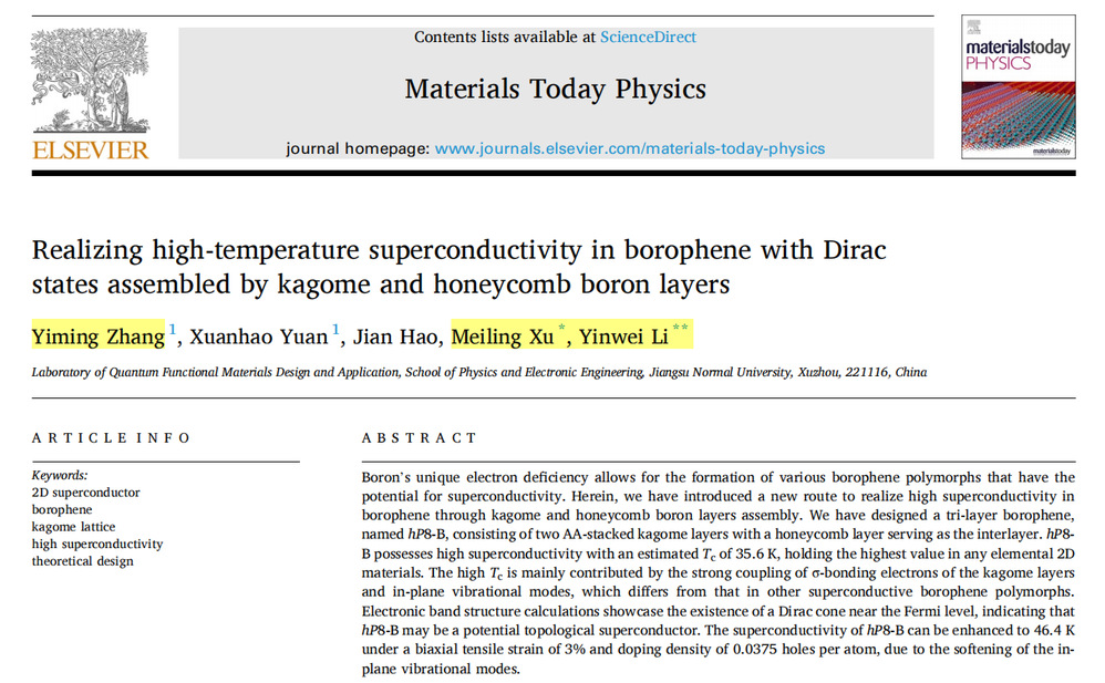 近日,李印威教授课题组在超导材料方面取得新进展,在国际知名期刊《Materials Today Physics》(JCR:1区,IF:11.5)上发表了题为“Realizing high-temperature superconductivity in borophene with Dirac states assembled by kagome and honeycomb boron layers”的学术论文。该论文第一作者为我院2022级凝聚态物理硕士研究生张逸铭,通讯作者为李印威教授和徐美玲副教授。