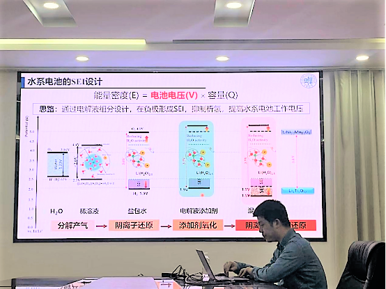结合本学院的相关研究方向,王飞研究员着重介绍了其研究团队在二次电池方面的一系列研究成果。电池内部的离子传导,是电化学反应发生的关键。作为离子传导的媒介,电解质是电池的重要组成部分,对电池的性能发挥起着关键作用。电池中的离子,在电解质、界面和电极材料中,处于不同的局域结构中。电解质的离子传导机制和电极/电解质界面、界相组成,均与电解质的结构紧密相关。以水溶液为电解液的水系电池,可以显著提升电池安全性,但是能量密度较低,限制了其实际应用。王飞研究员及其团队从水系电解液的体相溶剂化结构、电极/电解质界面和界相调控出发,优化水系电池电化学反应过程,提高其工作电压和循环稳定性,构建了一系列兼具高安全和高比的新型水系电池。此外,王飞研究员还分享了其团队在锌空气电池方面的一些成果。报告结束后,王飞研究员与在场师生就电解质筛选标准、电极电解液界面设计等问题进行了热烈且融洽的交流讨论。