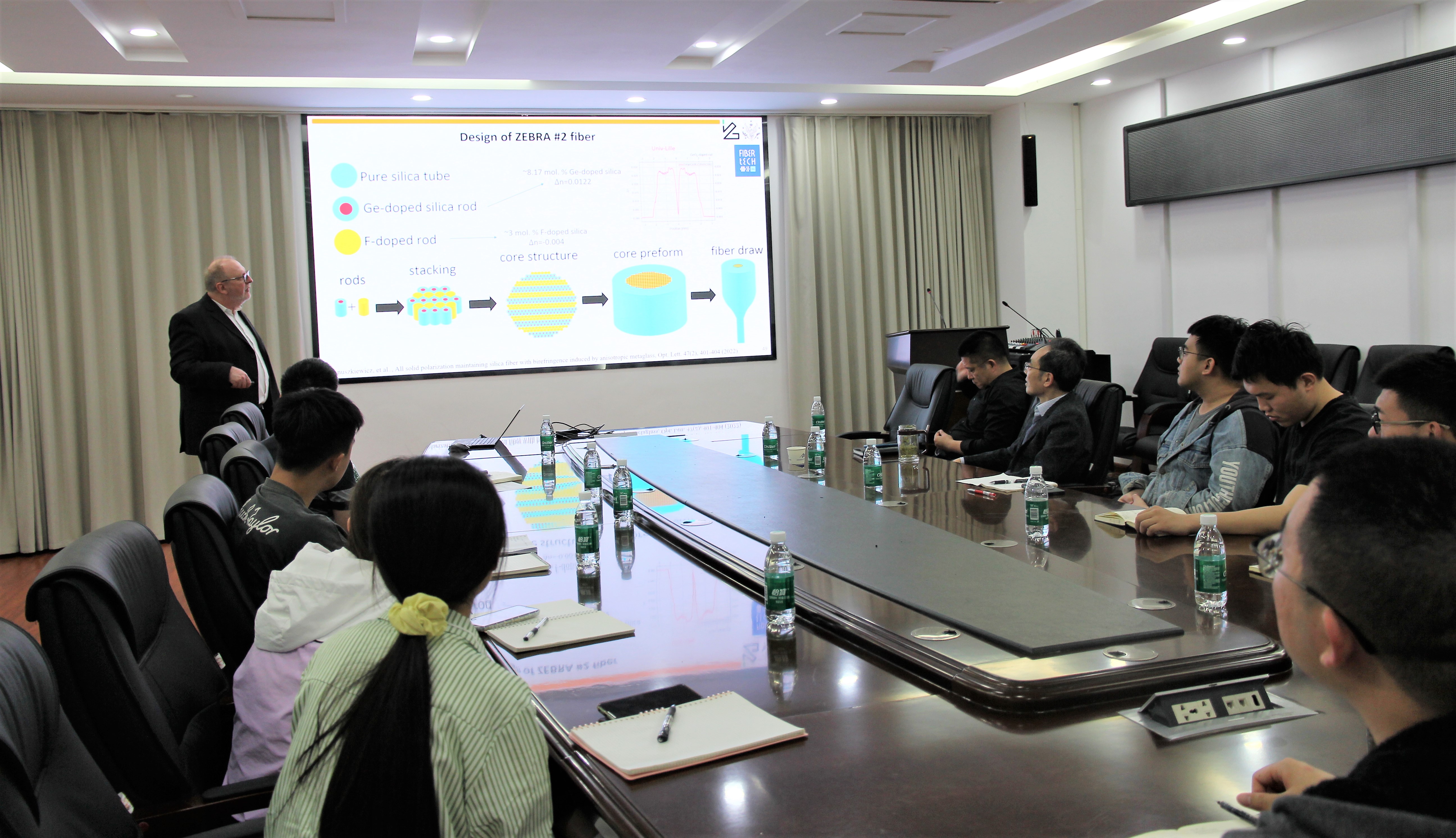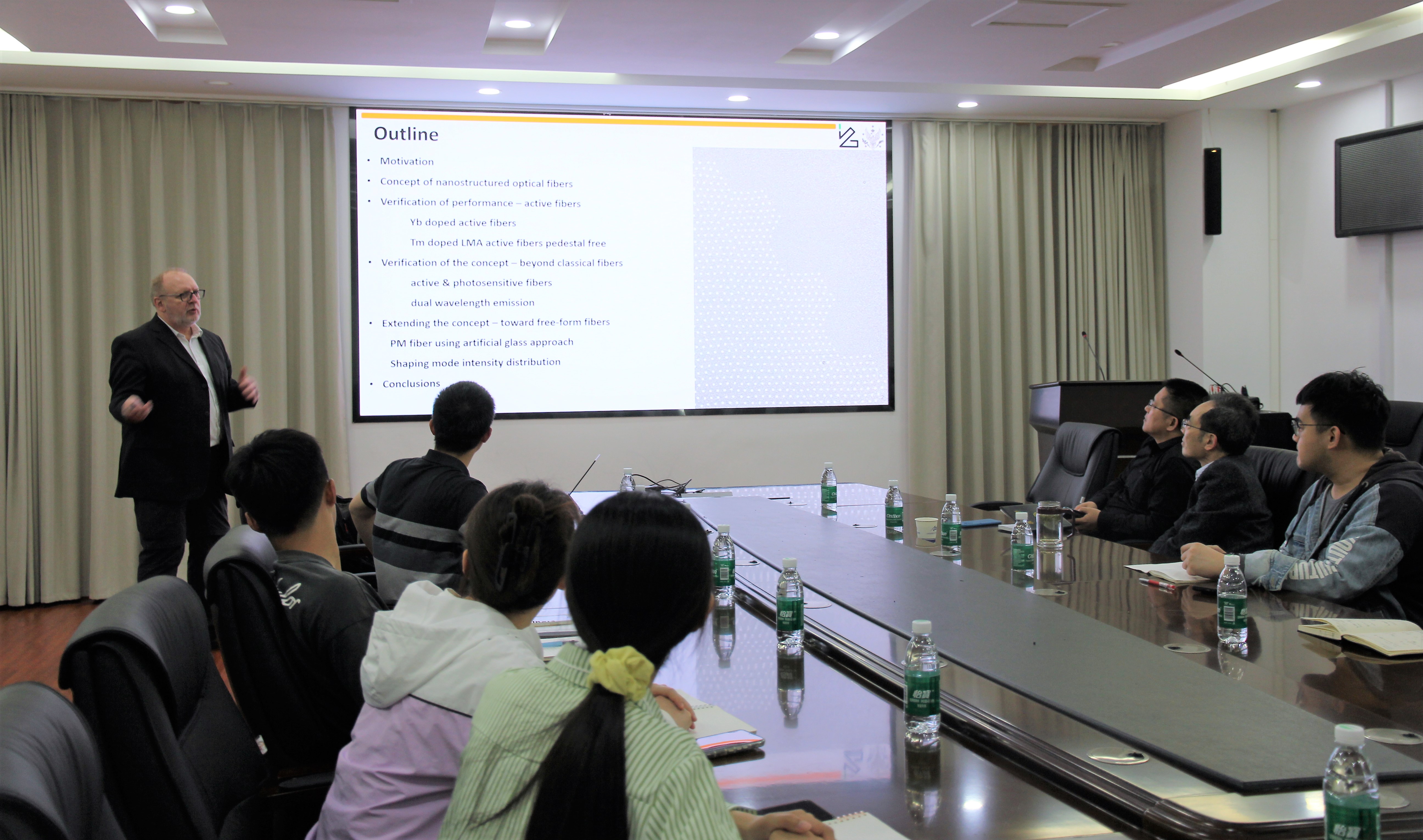 报告中,Ryszard Buczynski教授介绍了所在团队的研究方向和研究内容,Ryszard Buczynski教授团队长期致力于纳米结构光纤内部结构的研究,他讲到纳米结构光纤是一类新型光纤,其纤芯由排列成任意结构的各种玻璃纳米棒组成,他们深入研究了该光纤结构对活动纤维的主动和被动性能的影响,这在生物应用领域有很重要的价值。报告结束后,Ryszard Buczynski教授与沈德元教授所在团队成员进行了热烈且融洽的交流讨论。