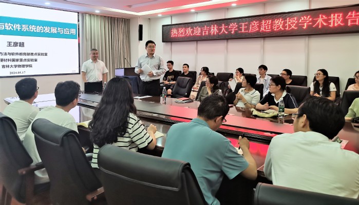 2024年5月17日下午,受江苏师范大学物理与电子工程学院邀请,吉林大学王彦超教授来院进行学术交流,在物电学院428会议室作了题为“物质模拟方法与软件的发展与应用”的学术报告,报告会由李印威教授主持,我院物理系老师及研究生参加了报告会。