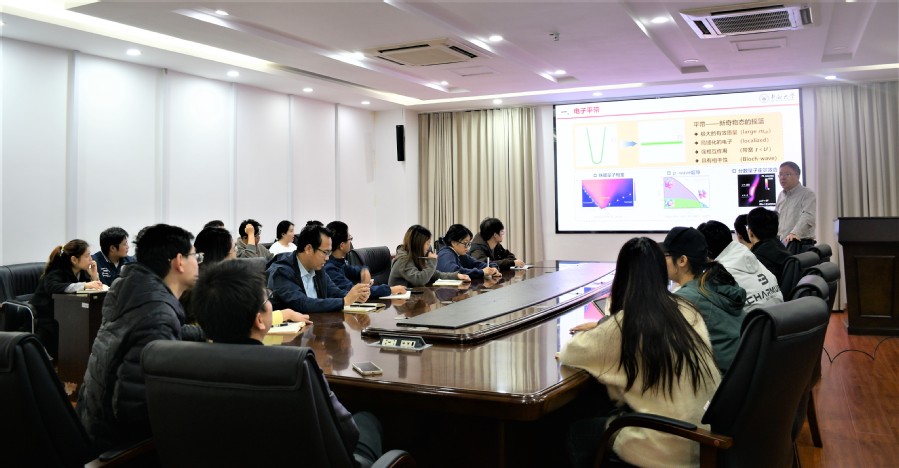 2024年11月15日上午,受江苏师范大学物理与电子工程学院邀请,东南大学苗霖教授来我院学术交流,在物电学院428会议室作了题为“电子平带材料中关联与拓扑”的学术报告,物理与电子工程学院老师和学生参加。