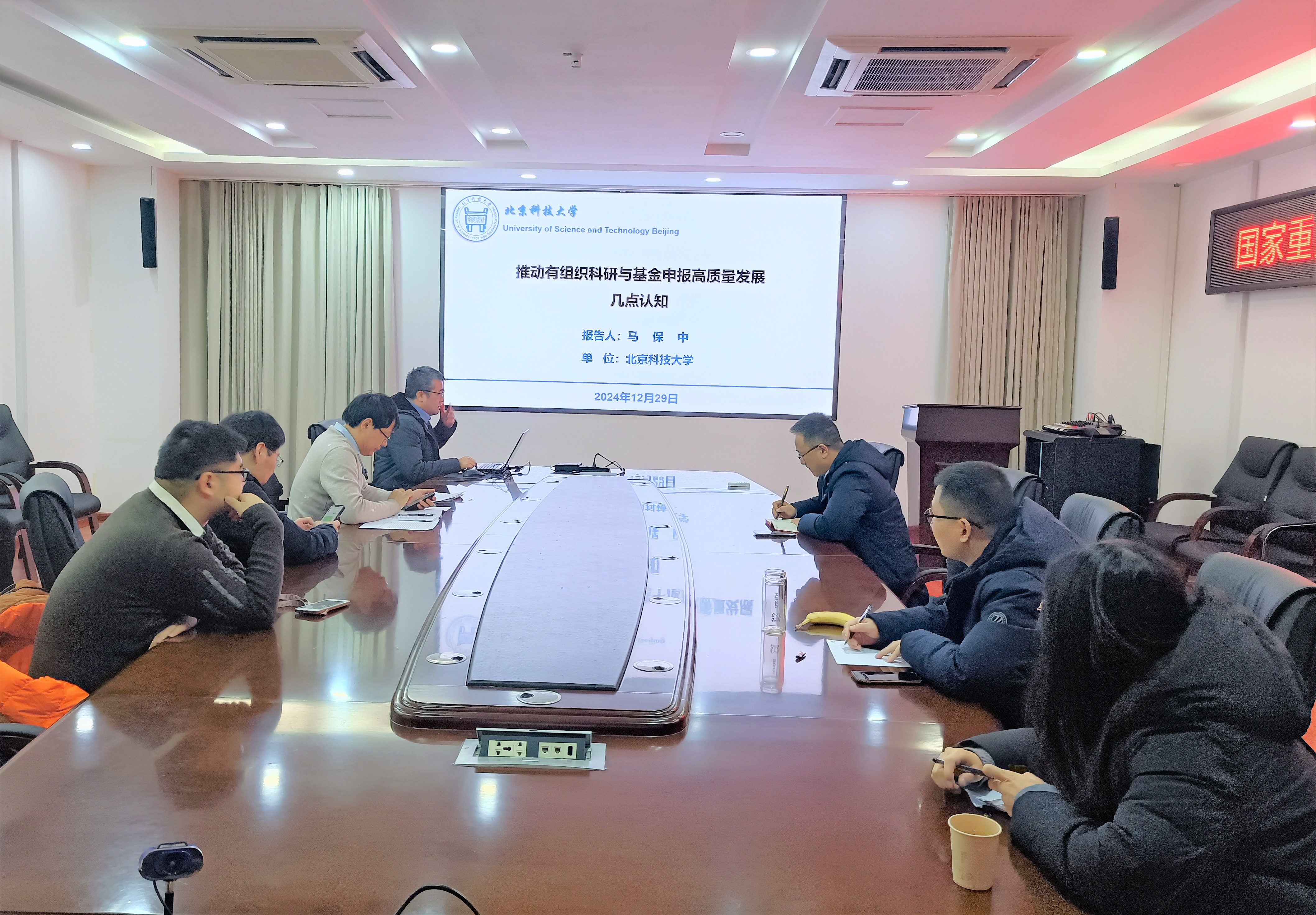 2024年12月29日下午,受江苏师范大学物理与电子工程学院邀请,北京科技大学马保中教授来我院学术交流,在物电学院428会议室作了题为“推动有组织科研与基金申报高质量发展的几点认知”的学术报告,报告会由张乐教授主持,物理与电子工程学院老师参加了报告会。