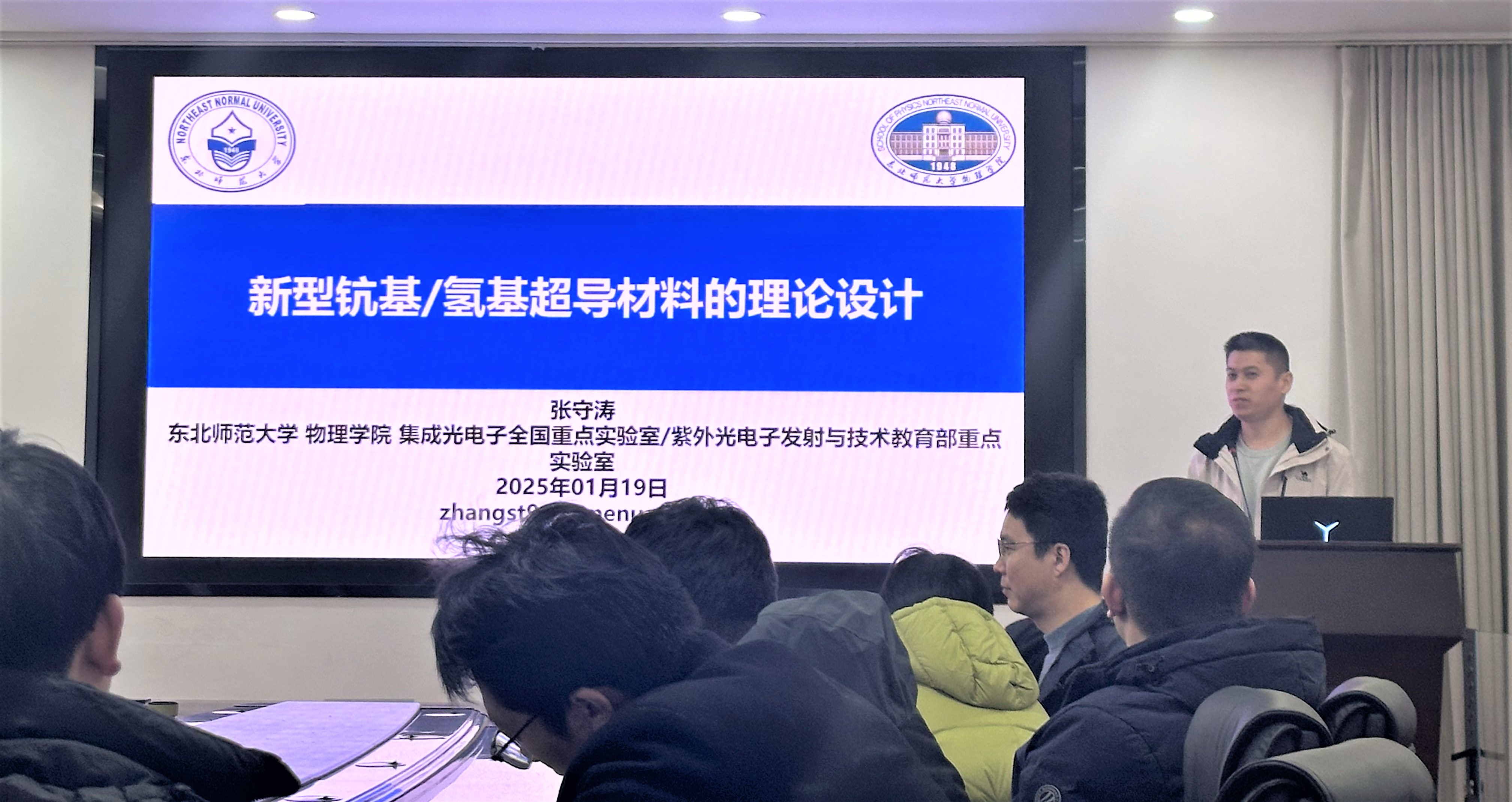 2025年1月19日上午,受江苏师范大学物理与电子工程学院邀请,东北师范大学张守涛副教授来我院学术交流,在物电学院428会议室作了题为“新型钪基/氢基超导材料的理论设计”的学术报告,报告会由李印威教授主持,物理与电子工程学院老师参加了报告会。